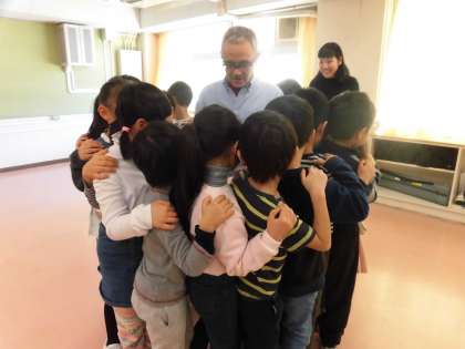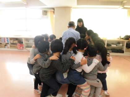 最後に、クラス全員で円になり「信頼のイス」を作りました。初めはうまく友だちの膝に座ることができなくて崩れてしまいましたが、何度か練習を繰り返し、最後にはメンバー全員の気持ちを1つにして成功させることができました。