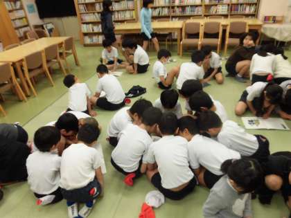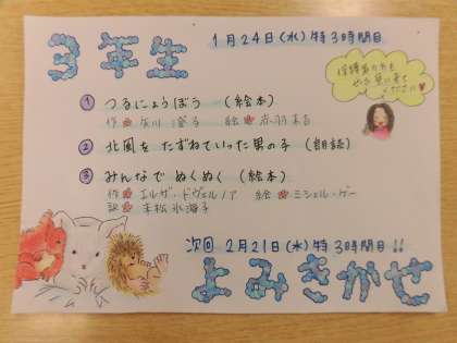 ちょっぴり難しい言葉づかいが出ても、静かに物語の世界をに浸っていた『つるにょうぼう』。「ヤギはどんな体のつくりになっているんだろう?」と教室に戻っても盛り上がっていた『北風をたずねていった男の子』。かわいらしいイラストとストーリーに引き込まれた『みんなでぬくぬく』。どの作品も楽しむことができました。久しぶりに読んでいただいた本を自分で読む時間もとることができ、1冊の本を仲良く囲んでいました。