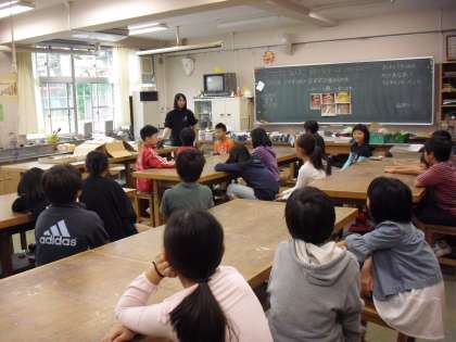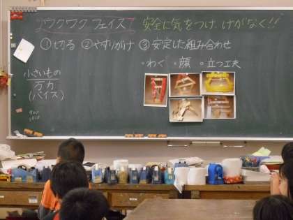 専科授業“図工:ワクワク フェイス”道具の安全な使い方や注意事項をしっかり説明してから・・・授業がスタートです。