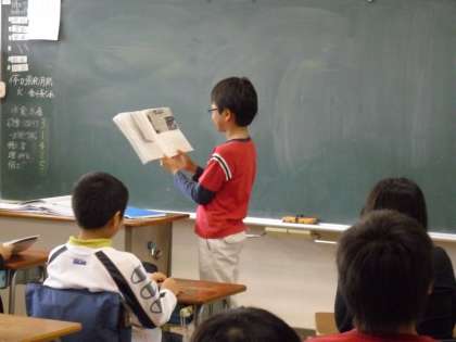 “朝の会:新聞の切り抜きから、自分の考え”を話していました。画面の児童は、パ・リーグのCSシーリーズのロッテに西武が負けたことの分析をしていました。発表者は、西部のファンです。