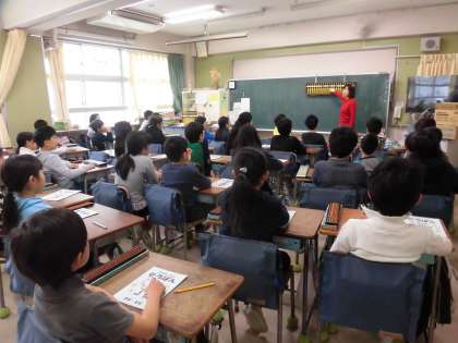 元気にあいさつをした後は、そろばんの学習です。今日は奥沢珠算塾の遠藤先生にご指導いただきました。基本的な指の動かし方などを確認した後は、足し算、引き算の仕方を教えていただき、練習しました。くり上がり・くり下がりのある時には10や5の補数をつかって計算することに少しとまどいましたが、練習をすることであつかい方にも慣れ、楽しんで学習に取り組んでいました。分かりやすいご指導をありがとうございました。