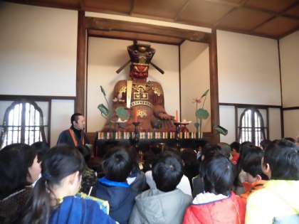 閻魔堂、仁王門、本堂、三仏堂などをめぐり、それぞれについてとても丁寧に説明していただきました。閻魔堂では、「よろしくお願いします」となぜか小さくつぶやきながら閻魔像に頭を下げている子もいて、ほほえましかったです。心のありようによってお顔の見え方が異なって見える閻魔像ですが、笑って見える子が3年生には多いようでした。本堂では、おめんかぶりの時に使うお面をかぶらせてもいただきました。それぞれの建物に意味があることも、子どもたちなりに理解することができました。
