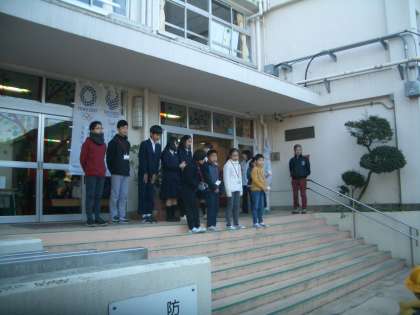朝の時間、八幡中学校の生徒が来校して本校の児童と一緒に挨拶活動を行いました。