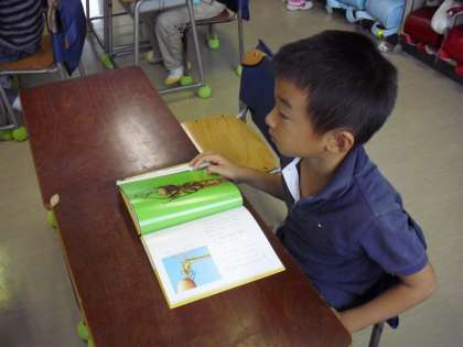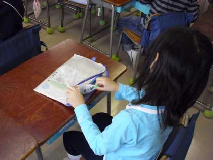 “朝の会”の前の様子です。先生が来るまで、自分から読書をしています。読んだ本を“読書カード”に書いています。そして、先生に連絡帳をみんな揃って出します。