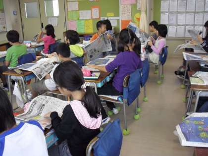 “国語科:新聞の読み方”教科書で学んだことを小学生新聞の紙面構成や記事・内容を実際に読んで学習に生かしていました。