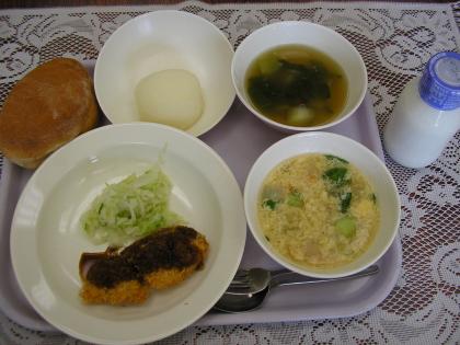 今日のメニューは、セルフフィュシュサンド、牛乳、チーズのふわふわスープ、くだものです。今日もアレルギー食を調理員さんが作ってくれました。醤油ベースのスープがそうです。