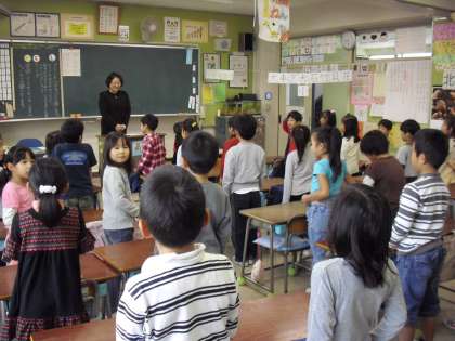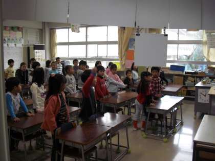今日は、世田谷区立小学校連合運動会の担当で担任の先生は、出張です。代わって、副校長先生が朝の会を・・・朝のあいさつ・・・健康調べを行っていました。子ども達は、副校長先生の話をきちんと聞いていました。