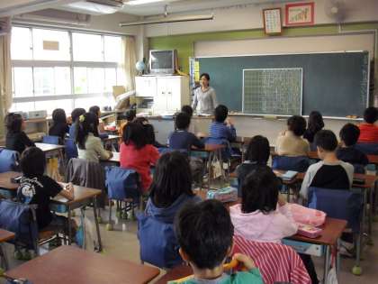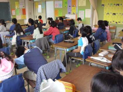 “朝の会”で先生のお話−内容は、先生がいる場面でも・・いない場面でも・・きちんと生活できていないといけません。具体的な事例をだして話していました。