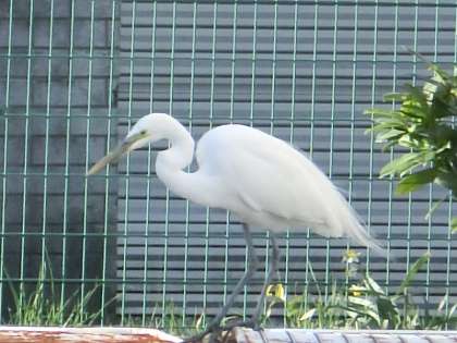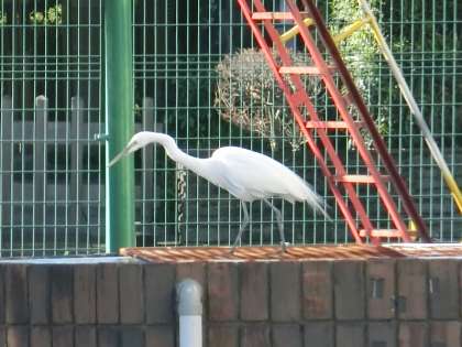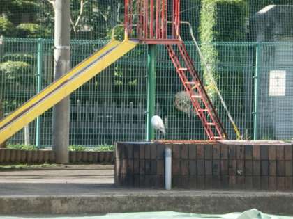 今朝、子どもたちが登校する頃、校庭のすべり台のあたりに大きな白い鳥がやってきました。