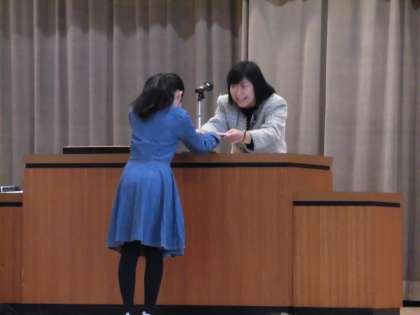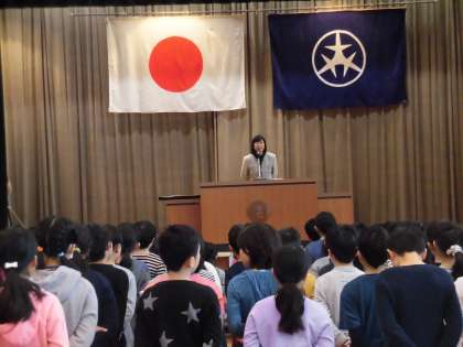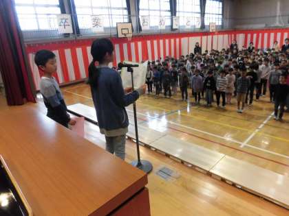 各学年の代表の児童が通知表を受け取った後、3年生の二人が学年を代表してスピーチをし、今年一年の成長を振り返りました。スピーチの内容と発表態度のどちらからも立派な成長ぶりがうかがえました。