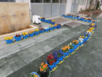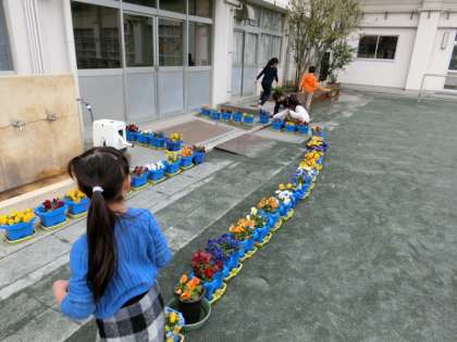 明日6年生が通るところに植木鉢を並べ、「パンジーの花道」を作りました。