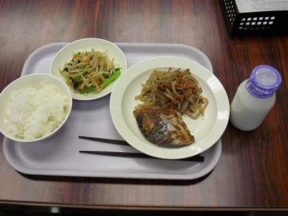 今日の献立は、ご飯、牛乳、鯖の味噌味、こんにゃくソティー、おひたしです。