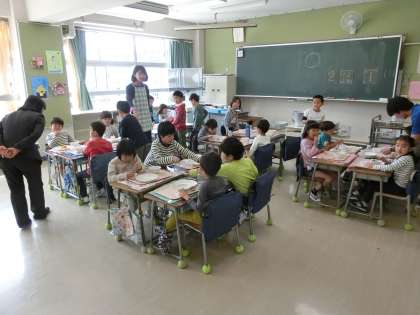 今日から1年生も給食が始まりました。楽しみにしていた給食はあっという間に食べ終わってしまいました。みんなおいしくいただけたようで、空になった器をうれしそうに見せてくれる子がたくさんいました。