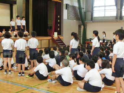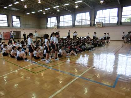 今日、各委員会を代表する委員長、副委員長の紹介と、委員会の仕事内容、お願いを、全校児童に紹介する集会をしました。