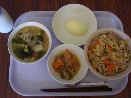 今日の給食は、開化丼(豚肉・玉ねぎ等を卵でとじてご飯にかけた丼です)、牛乳、みそ汁、果物です。卵の除去食の対応もしています。
