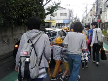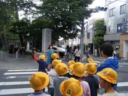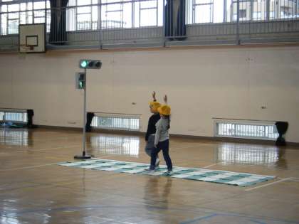 体育館に信号機や横断歩道を用意して、左右や後ろを見てから横断歩道を渡ったり、停車している車を避けて進んだりする練習をしました。その後、実際に浄真寺参道まで歩きました。子どもたちは、体育館で学んだことを生かして、安全に歩行することができていて、大変立派でした。