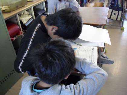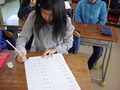 始業前の時間を活用して、“朝 自習”友達に教えう場面です。また、個人でプリント学習をしている子もいました。
