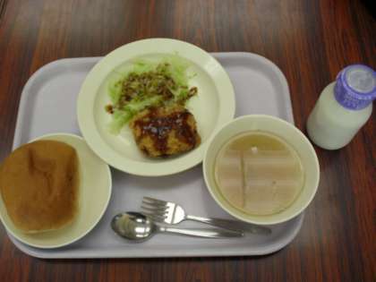 今日の献立は、丸パン、牛乳、茹でキャベツ、コロッケ、コンソメスープです。