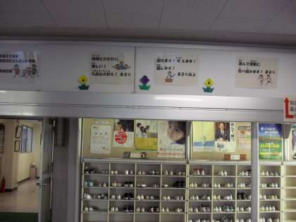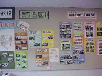 玄関には、校内研究の取組み・・・学校関係者評価の課題を生かして・・地域の教育力を活用した教育活動の掲示・・今年度の数値目標などが来校者にすぐに分かる工夫がしてあります。