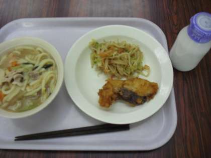 今日の献立は、味噌煮込みうどん、牛乳、魚の紅葉揚げ、おひたしです。