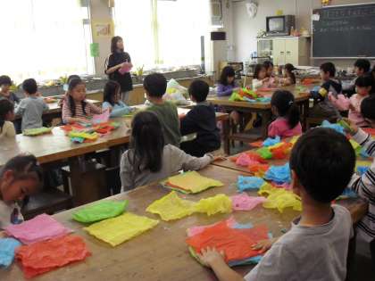 図工の授業風景です。きれいな薄い色紙を使って模様をつくります。