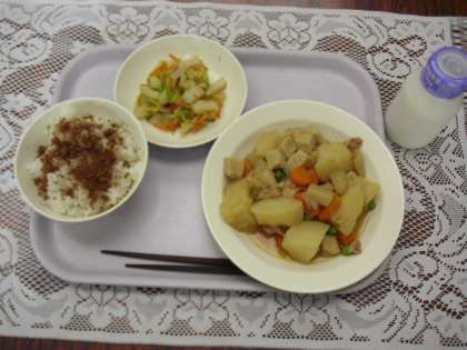 今日の献立は、ご飯、かつおでんぶ、牛乳、肉じゃがうま煮、はくさいのおかかかけです。