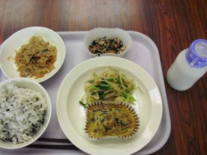 今日の献立は、わかめご飯、牛乳、切干大根煮、千草やき、おひたしです。今日も調理員さんがアレルギー対応食を作りました。小皿が対応食です。