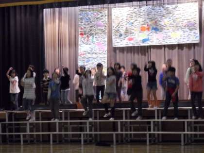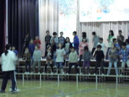 劇“海のふ・し・ぎ”を演じますが、今日は劇中で歌う歌や踊りの練習を中心に行いました。担任の先生と音楽専科がTTを組んでの指導です。