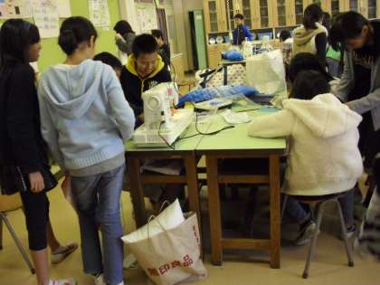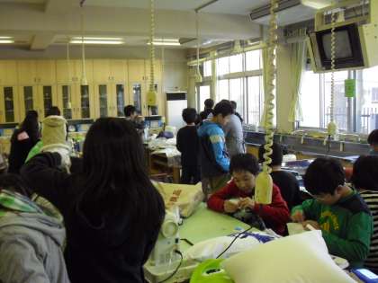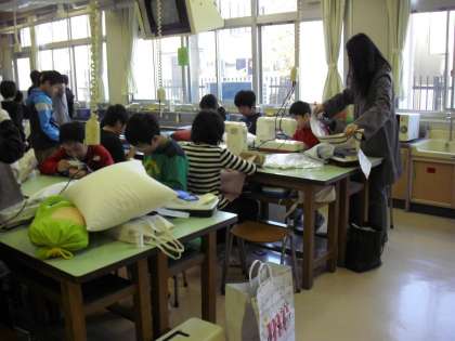 6年生は、“専科授業:家庭科”で、“クッションを作製”していました。ミシンや手縫いなど・・・クラスの仲間たちが、互いに教え合って学習していました。