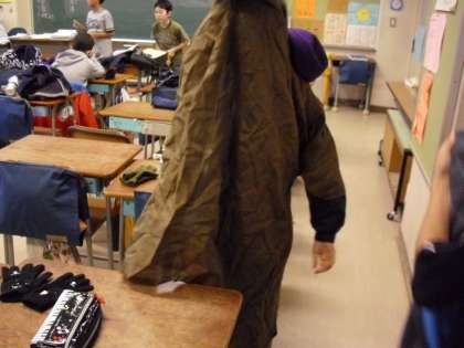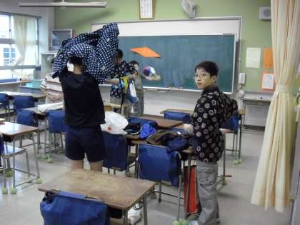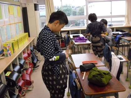 朝、学芸会の練習のために衣裳に着替え・・・。