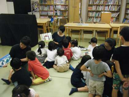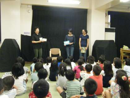 保護者の方々が、子どもたちが読み聞かせに集中できるように、本棚に目隠しをしてくださったり、手遊びをしてくださったりします。子どもたちも毎月楽しみにしている時間です。