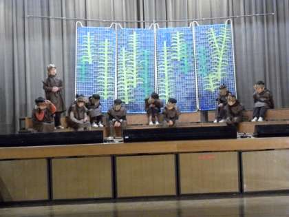 学芸会リハーサル−2・・・1年生は、“とべ! ヤゴたち”です。初めての学芸会・・緊張しながらも頑張っていました。当日をお楽しみに!