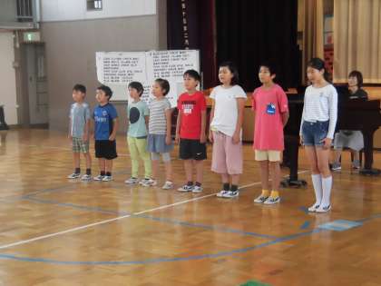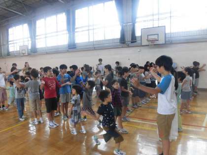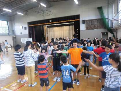 今回は授業で学習した「にじ」という歌を縦割り班の友達と踊りながら歌いました。