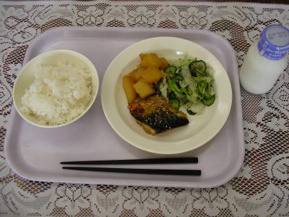 今日のメニューは、ごはん、牛乳、魚の七味焼き、じゃがいもの甘辛煮、野菜のゆかりかけです。