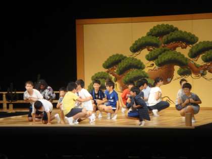 ワークショップでは、狂言の冒頭のセリフ「このあたりのものにてござる」やのこぎりで垣根を壊す動きを体験しました。また、代表児童は能の舞台の上で「きのこ」になりきって動き回りました。その後「附子」を鑑賞しました。