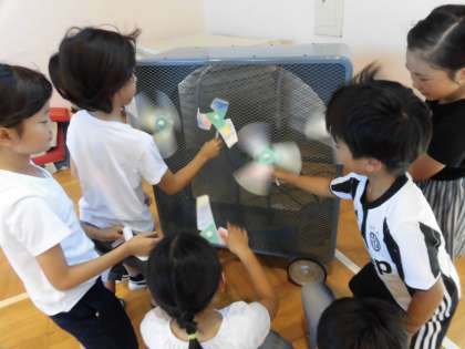 風車を扇風機にあてたり、自分で走って風車を動かしたりして発電していました。