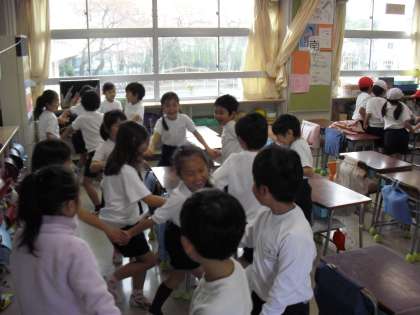 1年生の教室では、朝の会が始まり・・・“おはよう!あくしゅ!”の歌と表現で一日のスタートです。