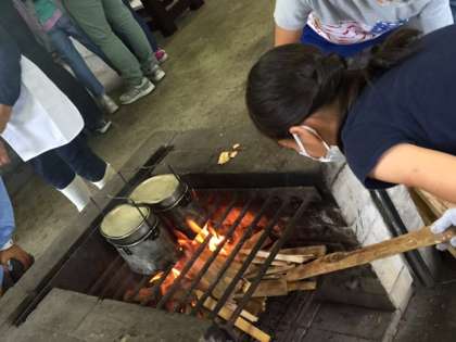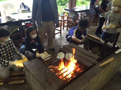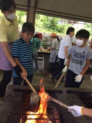 かまどに次々と火が着きました。ご飯係が用意した飯盒をかけ始めました。