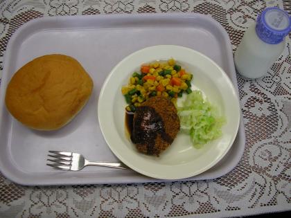 今日のメニューは、パン、牛乳、コロッケ、ゆでキャベツ、ベジタブルソテーです。