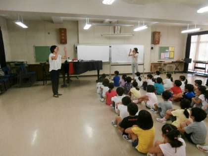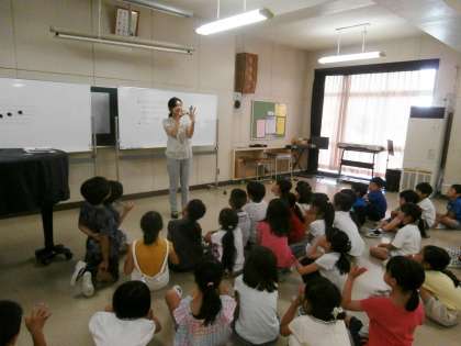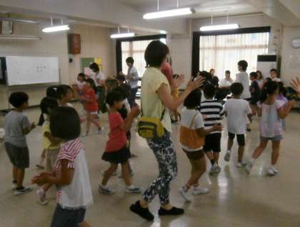 リズムに合わせて、歩いたり、指示にあわせて体を動かしたりしました。先生に目をしっかり向けて、体を動かさないで集中して指示が聞けると、リズムや音がぴったり合って、心地よさを感じることができました。