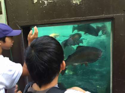 こちらの水槽では、投げ入れられた餌を食べる大魚が迫力満点でした!