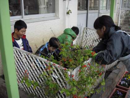 飼育 栽培委委員会−教室で打ち合わせをしてから・・・親鳩の会(卒業生の保護者の会)のゲストティチャーを3人迎えての作業の様子です。
