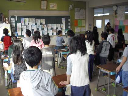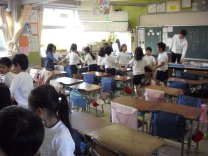 2年生の教室−朝の会で、“思い出のアルバム”の歌を歌っていました。2年生になってからのことを思い出して、歌っているようでした。