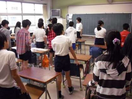 6年生の教室−“朝の会:あいさつ”・・・一日のスタートです。