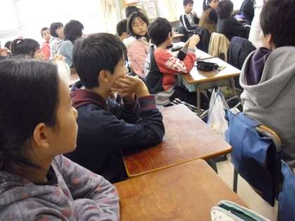 “朝の会:先生の話”を真剣に聞いている子どもの姿です。