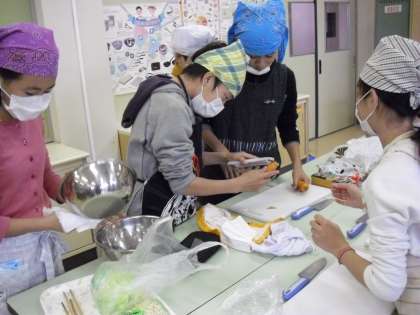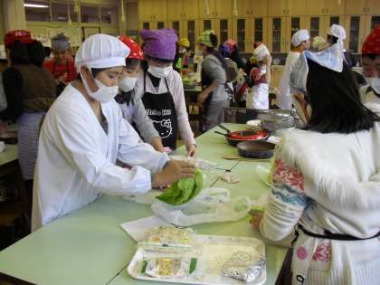 画面は、“家庭科:調理実習”・・・男子も包丁で野菜を切ったり、下ごしらえをしていました。男女仲良く、協力し合って調理作業をしていました。