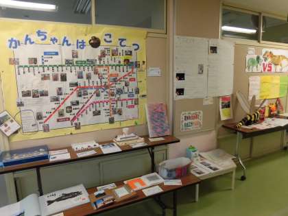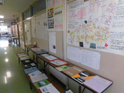 子どもたちが夏休みにがんばった自由研究を学級前の廊下に展示します。