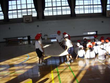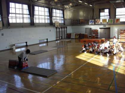 “体育”いろいろな器具を使って・・・いろいろな動きをします。先生がどうのようにするいか、安全にどうのように気をつけるか等を先生が師範して説明していました。