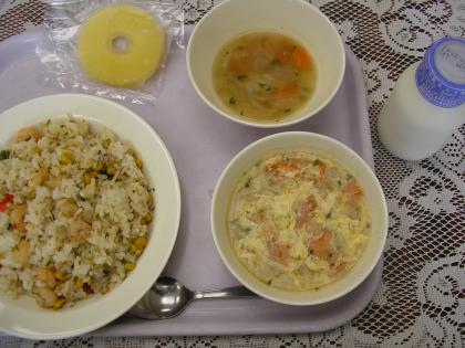 さて、今日のメニューは、ナシゴレン、牛乳、卵スープ、くだものです。今日もアレルギー対応を調理員さんがしてくれました。