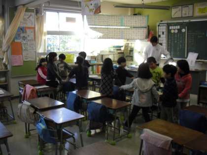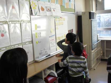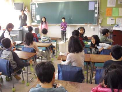 “朝の会”今日の日直さんが前に・・・朝の会が始まります。